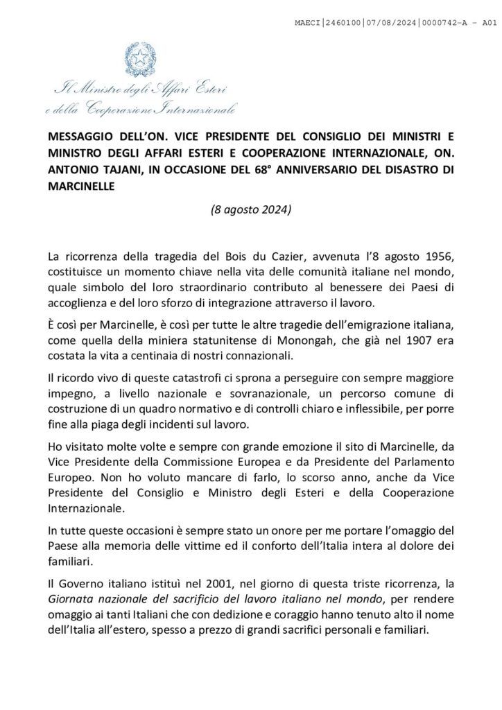 Pubblichiamo il messaggio dell’On. Vice Presidente del Consiglio dei Ministri e Ministro degli Affari Esteri e Cooperazione Internazionale, On. Antonio Tajani, in occasione del 68° anniversario del disastro di Marcinelle.