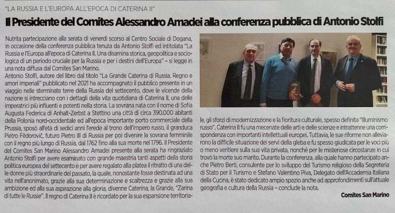 Si è tenuta venerdì scorso, presso il Centro Sociale di Dogana, una conferenza pubblica promossa dal Comites San Marino, che ha visto protagonista Antonio Stolfi con l’intervento dal titolo “La Russia e l’Europa all’epoca di Caterina II. Una disamina storica, geopolitica e sociologica di un periodo cruciale per la Russia e per i destini dell’Europa.”