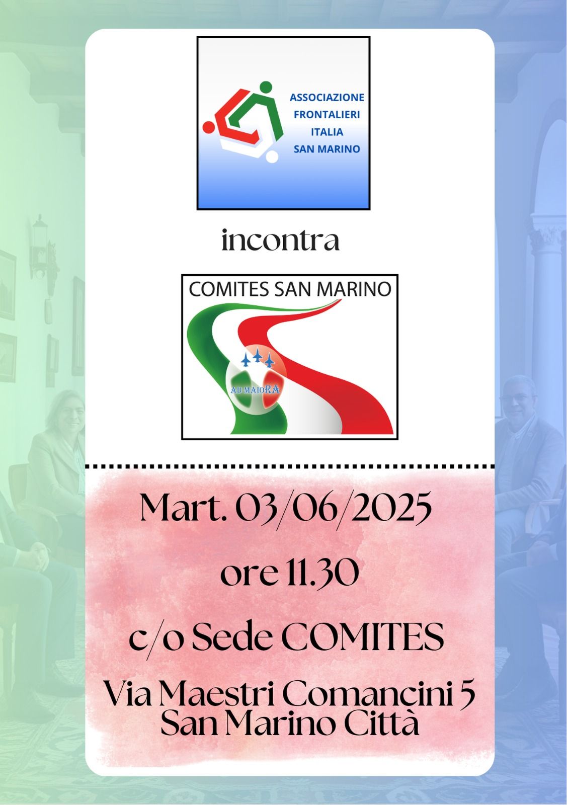 Martedì 3 giugno 2025 alle ore 11:30, presso la sede del Comites San Marino in via Maestri Comancini 5, San Marino Città, si terrà un importante incontro tra il Comites San Marino e l’Associazione Frontalieri Italia-San Marino.