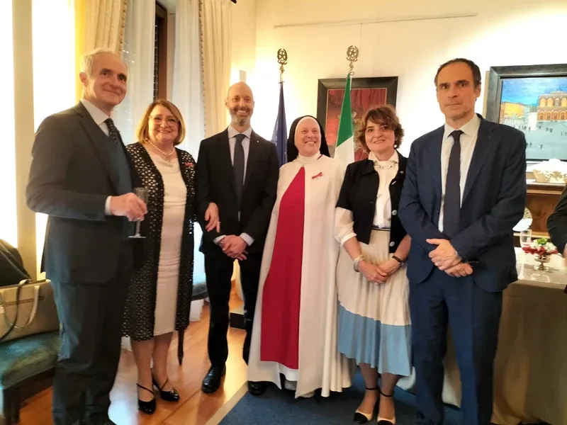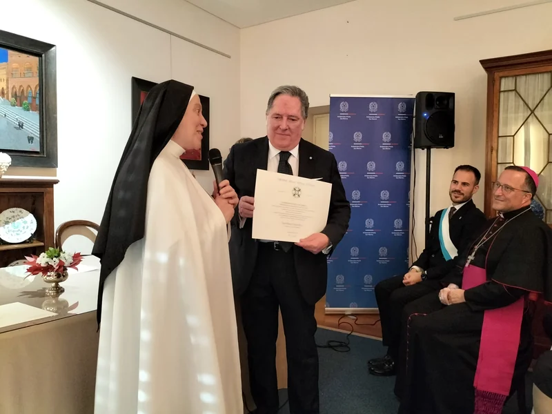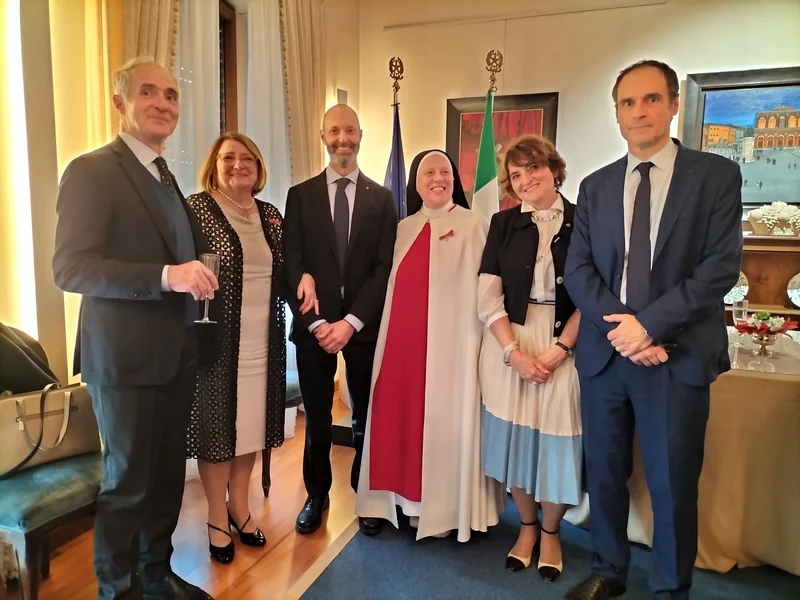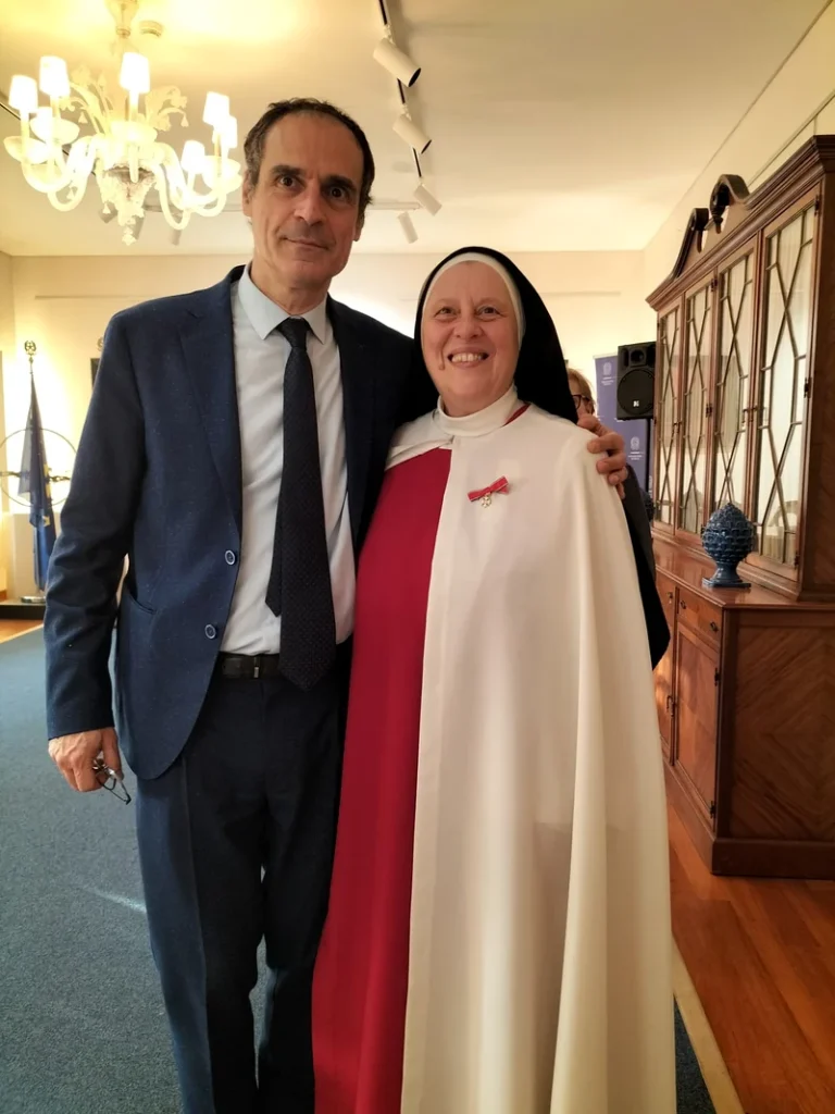 In rappresentanza del Presidente della Repubblica, l’Ambasciatore d’Italia Fabrizio Colucci ha conferito l’onorificenza di Ufficiale a Suor Maria Gloria Riva, e quella di Cavaliere a Meris Monti e Vito Testaj, per i meriti distinti nel loro operato.