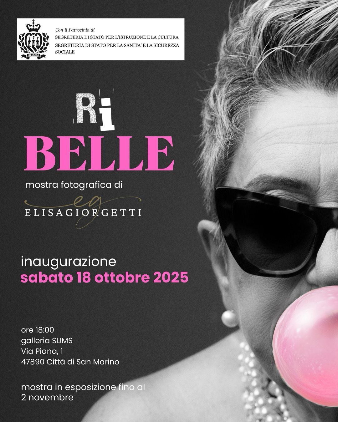 Sabato 18 ottobre, presso la Sala Conferenze del Palazzo SUMS a San Marino Città, è stata inaugurata la mostra fotografica “Ri Belle”, realizzata dalla fotografa sammarinese Elisa Giorgetti. L’evento ha visto la partecipazione di Riccardo Orazi e Samanta Tonelli, adottanti GACI (Greyhound Adopt Center Italy – adozioni Levrieri), e del Presidente del Comites San Marino, Alessandro Amadei.