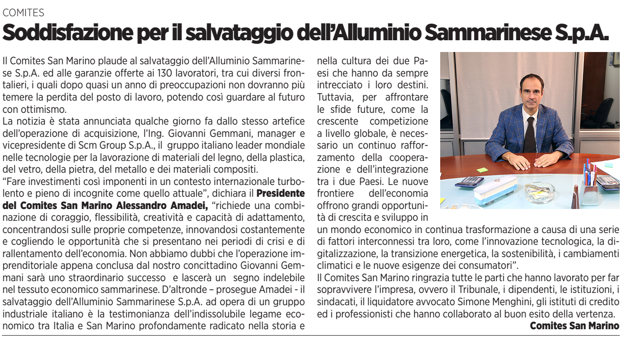 Salvataggio dell’Alluminio Sammarinese S.p.A.: soddisfazione da parte del Comites